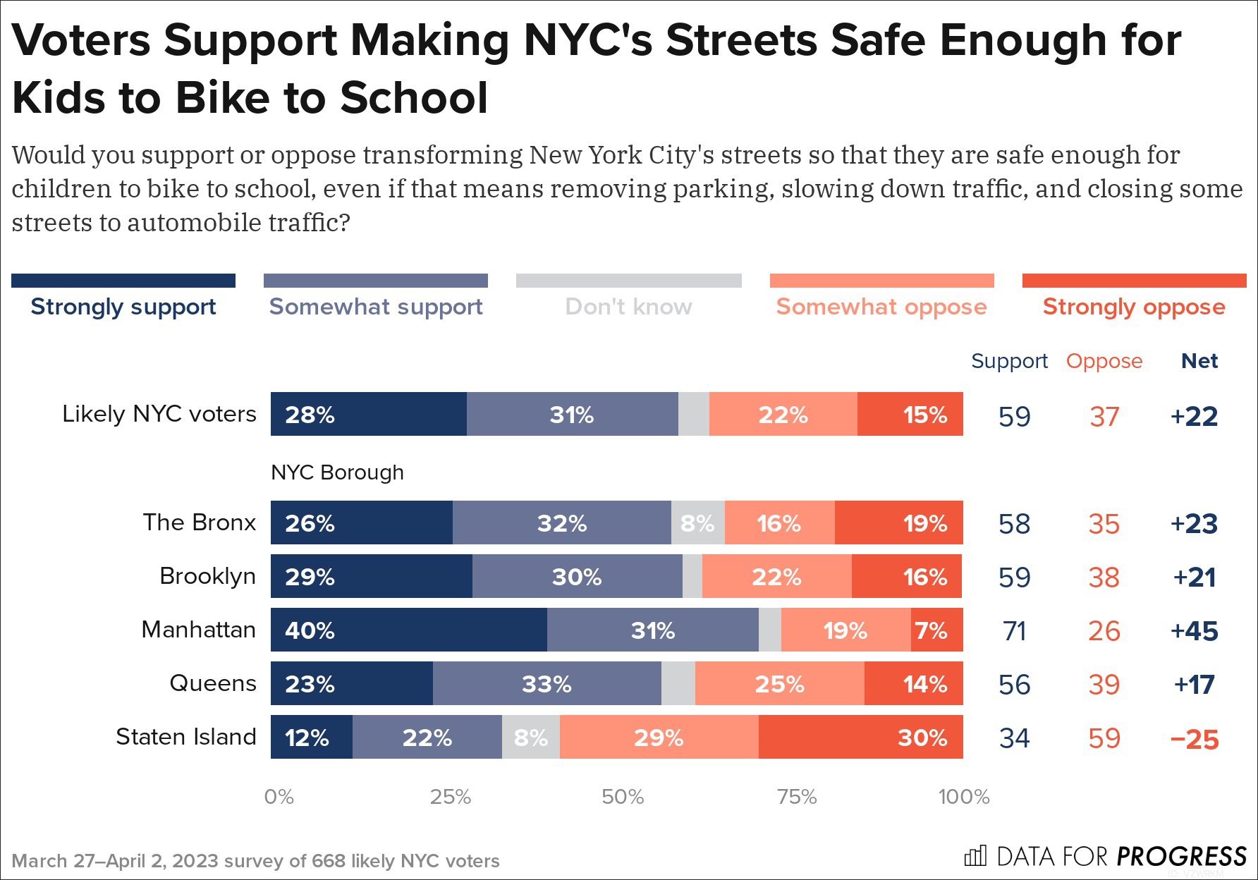 A majority of New Yorkers want the city to make streets safer for kids to bike and walk — even if it makes driving harder or removes parking, according to a newly-released survey that showed strong support for devoting street space to people, and not cars.