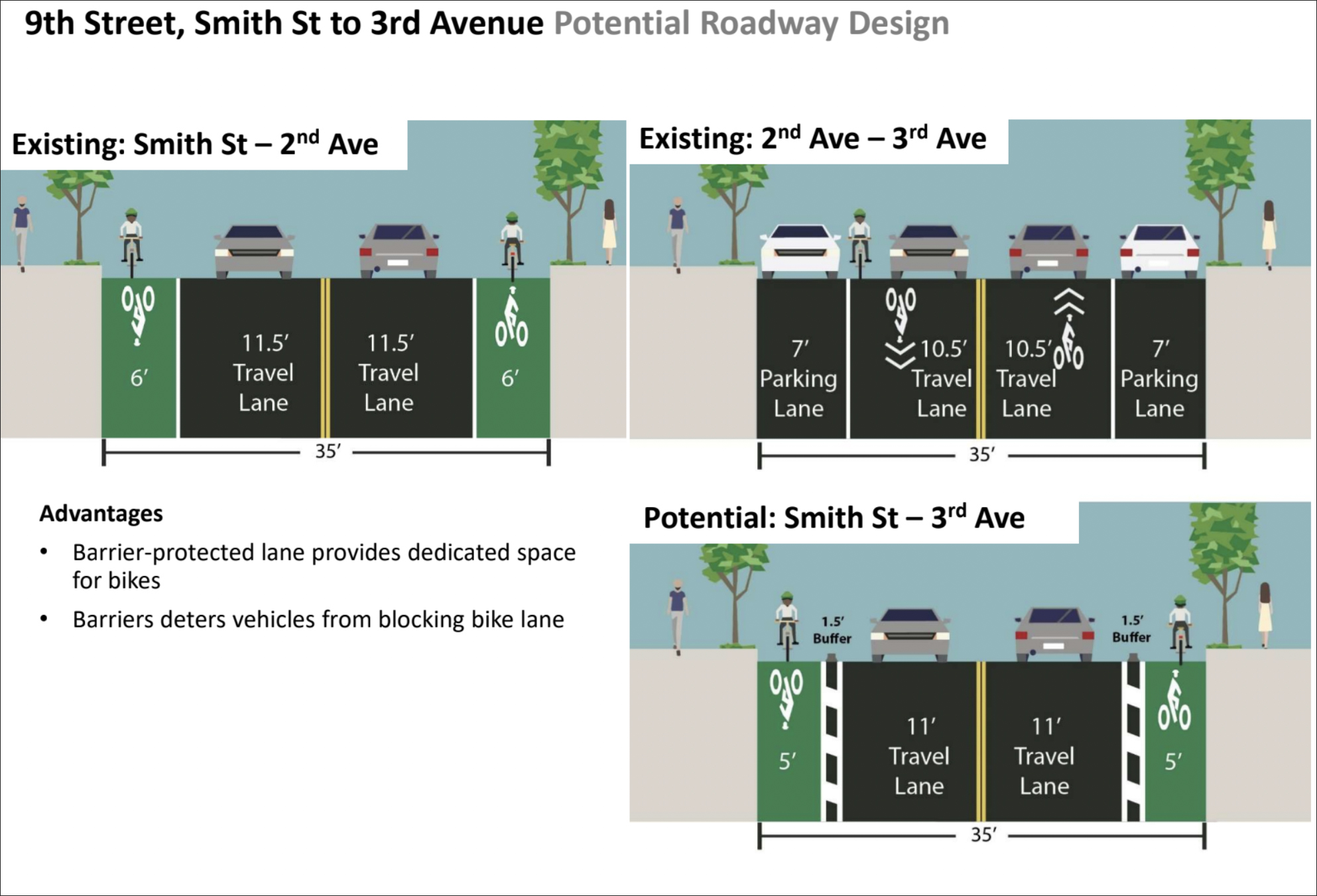 DOT’s initial concept, unveiled on Wednesday night, would remove parking on the block between Second and Third avenues to make room for a five-foot buffer-protected bike lane in each direction. The protected bike lanes would continue west of Second Avenue to Smith Street — where today the strip has green-painted bike lanes without any protection or separation from traffic, officials said during an in-person “community visioning session.”