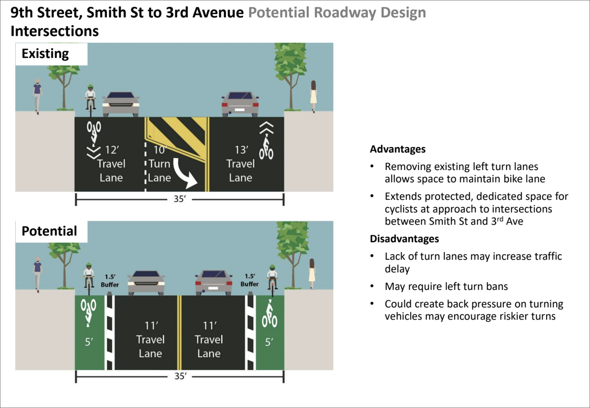 DOT also wants to remove 10-foot left turn lanes from the intersection to make room for the protected bike lanes — which, Johnson said, may eventually lead to DOT banning left turns along the corridor if the lack of turning lanes causes too much congestion.