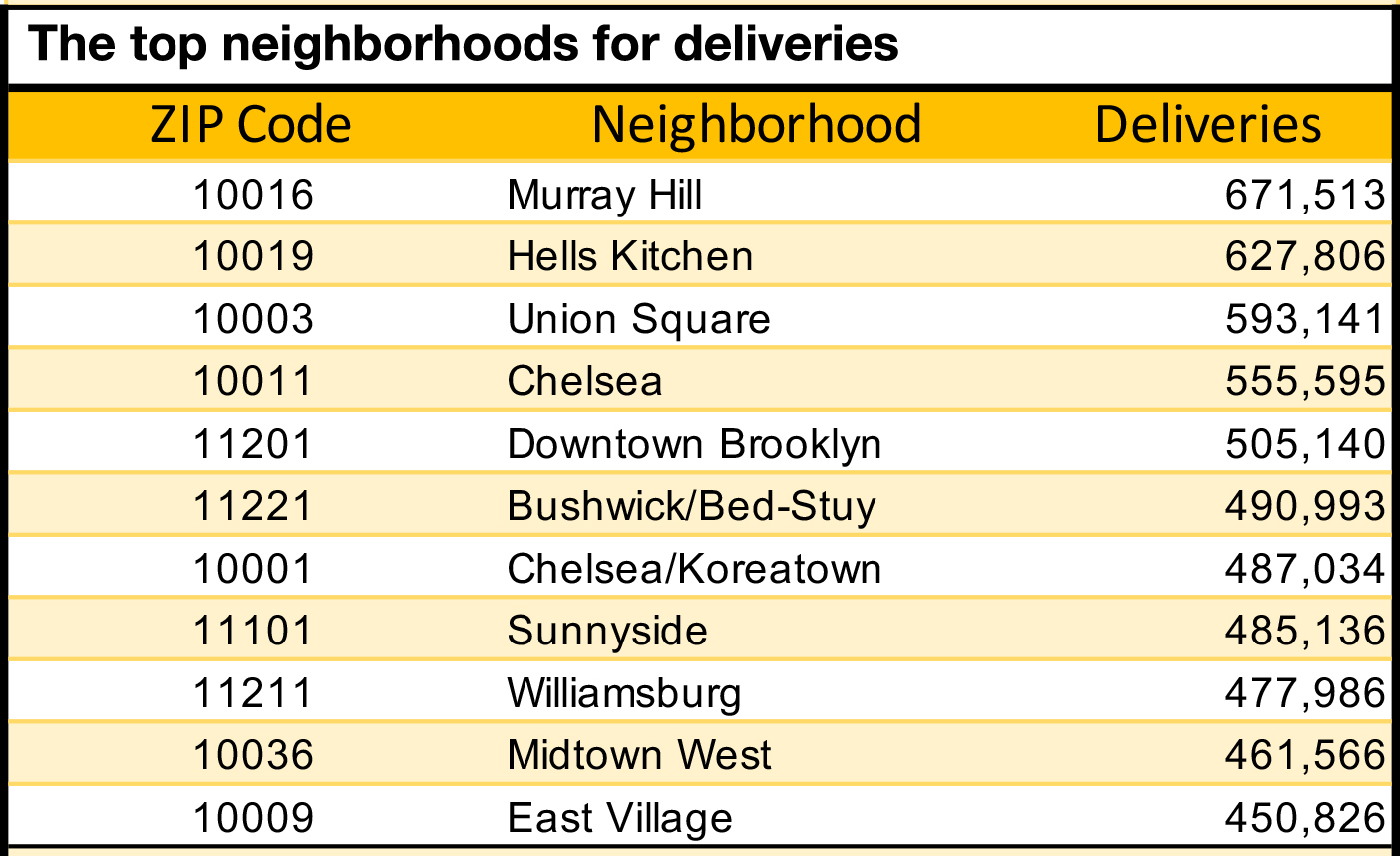 - And in the ZIP codes that make up the bulk of Community Board 6 in Midtown East (including 10003, 10009, 10010, 10016, 10017, and 10022), residents there ordered a staggering 2,775,192 deliveries or roughly 30,000 a day.