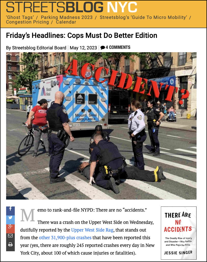 The incident is one of hundreds of injury-causing crashes that occur every day in New York City; according to the NYPD, there have been 12,876 crashes that have caused injury through May 14, or an average of 96 injury-causing crashes per day. So far, 3,062 pedestrians have been injured in those crashes, and 34 have been killed.