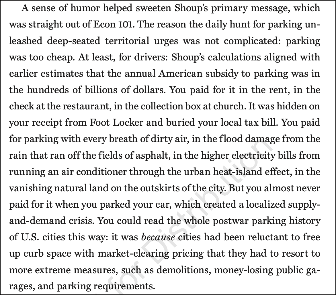 GK: But drivers don’t see the terrible conditions they create. If you have the book in front of you, listeners, go to page 150 [or look at it, right] because there’s a section about all the ways in which our society subsidizes car ownership and parking. And it’s like a really long list, and there’s another part of the book where you talk about all the externalities. And it’s just amazing to me that otherwise smart people, who can see those externalities on other social problems, can’t see it on cars.
