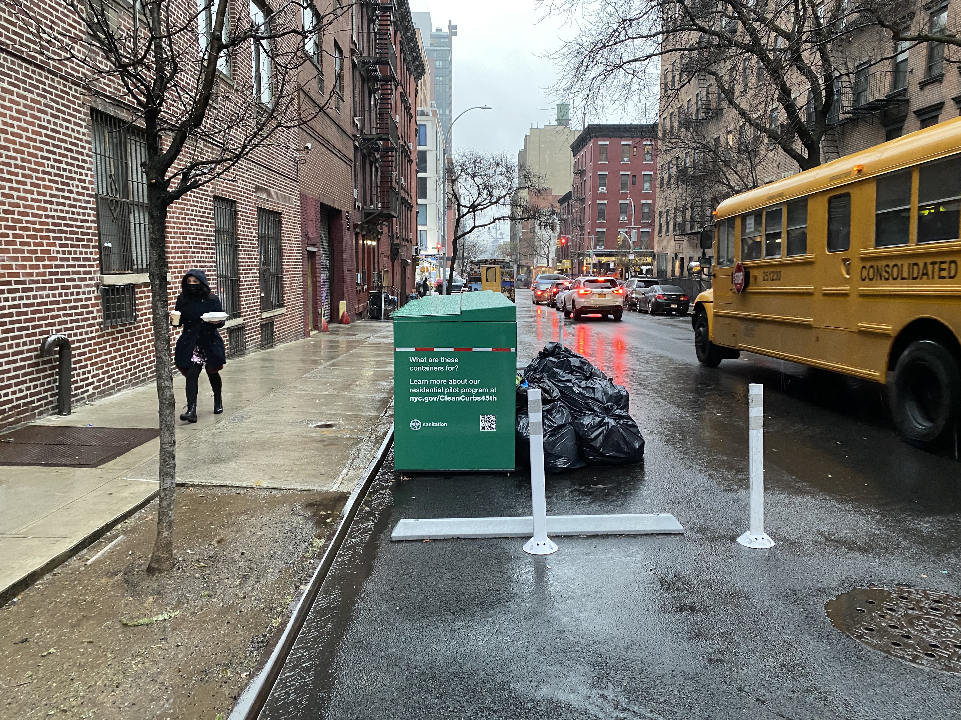 DSNY is currently testing street-based trash collection with its Clean Curbs pilot, which placed shared containers on commercial strips in all five boroughs and on one residential block in Hells Kitchen. Commissioner Jessica Tisch deemed the effort “not scalable” citywide because it drained resources and some bags still ended up outside the containers.