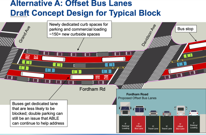 “We look forward to presenting a refined proposal for upgraded bus priority on Fordham Road to the community this month and continuing to develop designs for offset lanes with their feedback,” DOT spokesman Vin Barone said in a statement. “This design would create dedicated curbside loading space to help keep our bus lanes clear for the 85,000 daily commuters on the corridor who deserve faster and more reliable service — and with minimal traffic diversions that would affect bus service on north and south corridors.”