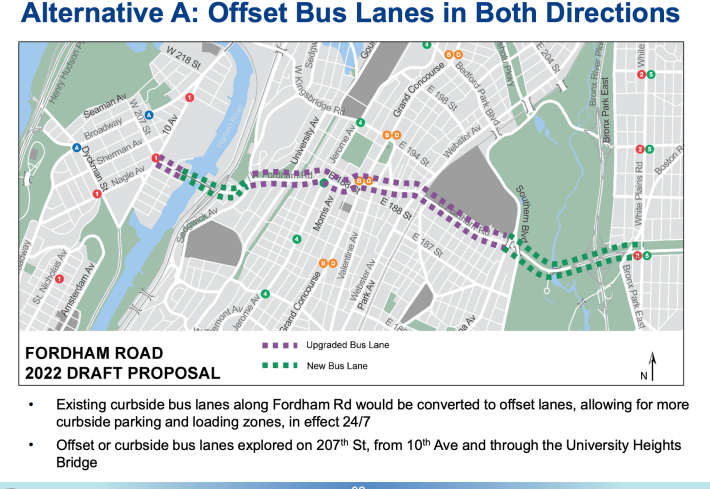 DOT’s revised effort will see existing bus lanes shifted and extended beyond its current termini of Sedgwick Avenue to the west and Crotona Avenue to the east — to the University Heights Bridge and White Plans Road, respectively. The agency will also “explore” further extension across the bridge to 10th Avenue in Manhattan, according to the presentation.