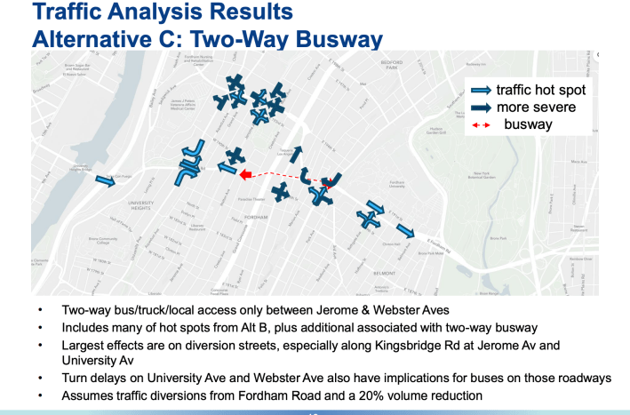 DOT said its traffic study predicted 20 percent of drivers who would normally be on Fordham Road at peak hours would shift to other times, move to different streets, or choose a different travel mode.