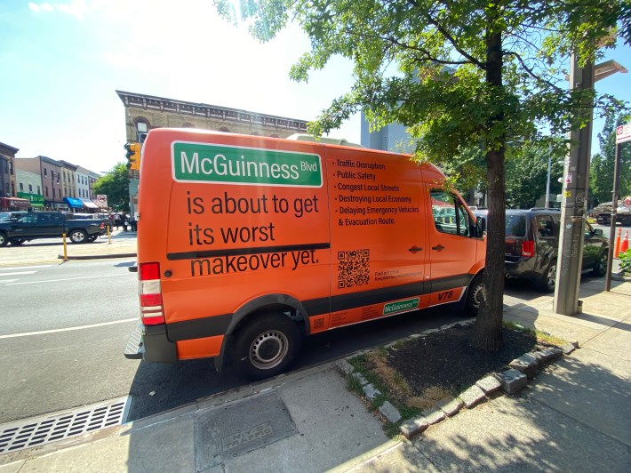 Facts aside, “Keep McGuinness Moving” has come out in force across the neighborhood — hanging up banners, detailing a van with anti-redesign messages, and setting up a stand at the corner of McGuinness and Nassau Avenue to talk to passersby.