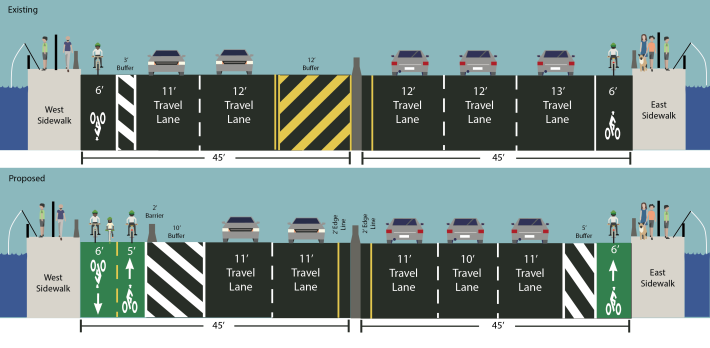 Per a schematic shared by the DOT, both north- and southbound cyclists have reason to cheer: The murderstrip will be getting a five-foot-wide buffer, while the existing buffer-protected bike lane on the west side of the bridge will be bolstered into an 11-foot-wide, two-way fully protected bike lane.