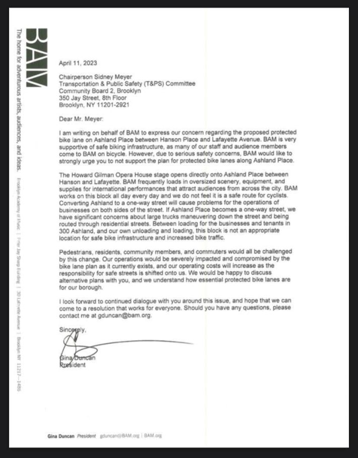 “Due to serious safety concerns, BAM would like to strongly urge you to not support the plan for protected bike lanes along Ashland Place,” BAM President Gina Duncan wrote in an April 11 letter to Brooklyn Community Board 2’s Transportation Chair Sidney Meyer.