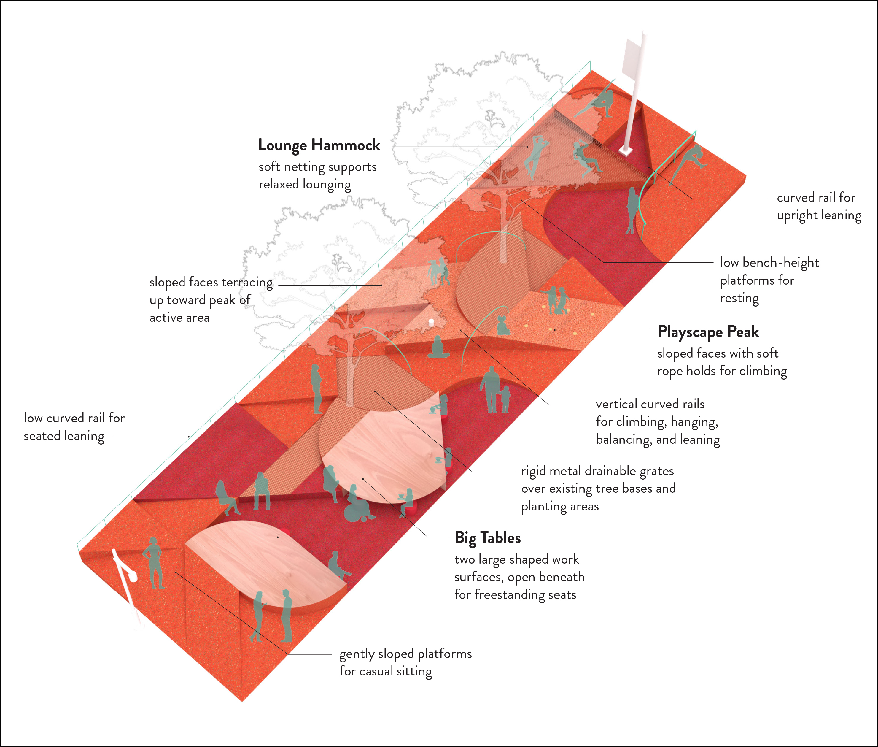 Rather than a one-size-fits-all approach to the design of public space, the installation offered this environmental range to better serve the needs of populations often marginalized in the public realm, including people with disabilities, children and their caretakers, teenagers, the elderly and more. After the social isolation and trauma of the pandemic, Restorative Ground sought to create a shared space for individual and collective engagement, recreation, escape and healing in the public realm.