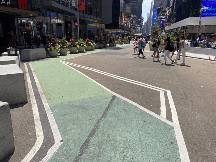 Not every block reflects DOT’s initial proposal. West 48th to West 49th echoes the conceptual design — with potted plants and concrete police barricades to separate the roadway from the sidewalk. Streetsblog observed little car traffic, but plenty of pedestrians, on the redesigned strip on a recent afternoon: