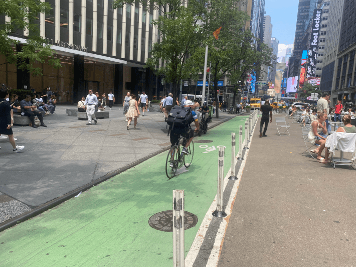 When faced with deciding between a two- or a one-way bike lane down Broadway from West 38th to West 40th, the DOT went with the latter — but regardless, pedestrians seem to be satisfied.