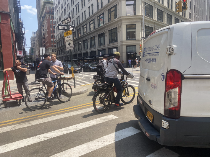 The Broadway Vision project proposed transforming these two city blocks into shared streets similar to other sections of Broadway. The bike lanes are right next to the one-way car lanes, yet sharp turns and illegally parked cars make these stretches harrowing for two-wheelers: