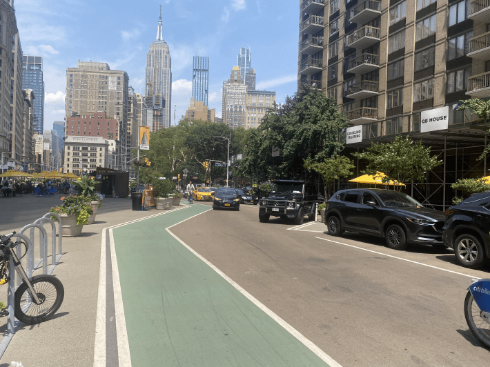 Currently, between W 32nd and W 27th street, the road narrows and the marked southbound bike lane disappears. The car lane snakes down due to the parking spaces alternating between the left and right side, and the remaining space is left for public seating and various dashes of greenery.