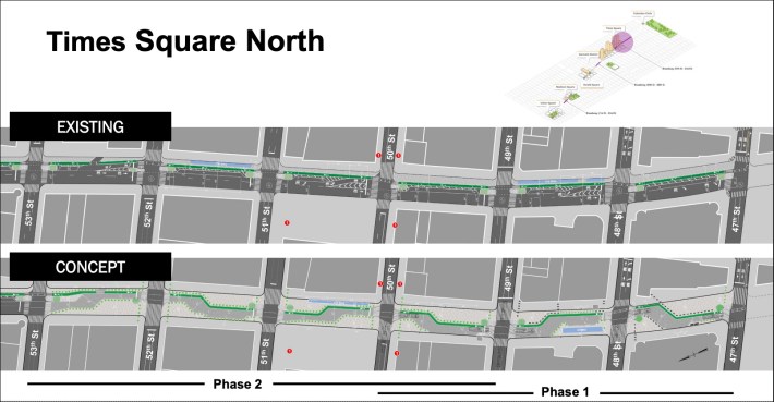 The segment of Times Square included in the proposal is divided into two phases. For Phase 1 DOT has already started to modify the southbound road between West 47th and West 50th streets, extend the pedestrian space off the curb, and create a “shared street” featuring adjacent car and (unprotected) bike lanes from West 47th Street to West 49th Street. The city also plans to expand the size of the pedestrian plaza north of West 49th Street, while merging the car and bike lanes into a single, shared lane near the south end of the block.