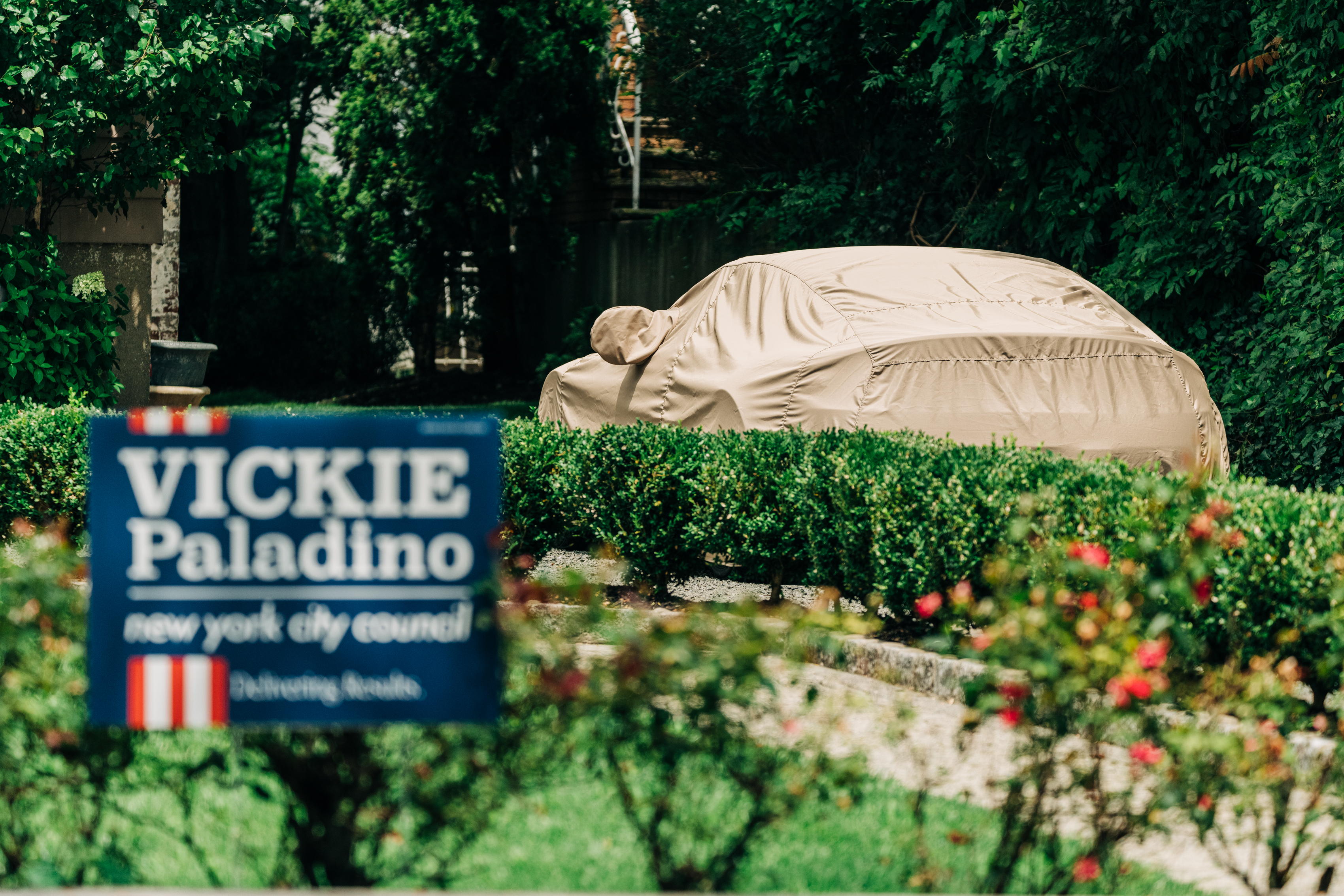 Streetsblog looked for the car again on Friday, but by then the only car parked in the driveway was concealed under a cover — the license plate hidden from view.