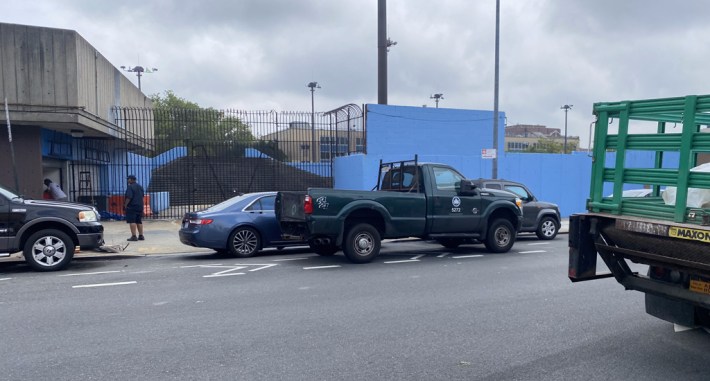 The Parks Department’s dangerous behavior puts its own patrons at risk — the adjacent public pool is particularly busy, with visitors coming via foot, car, and bike. The addition of illegally parked city vehicles makes for a particularly hazardous pedestrian obstacle course.