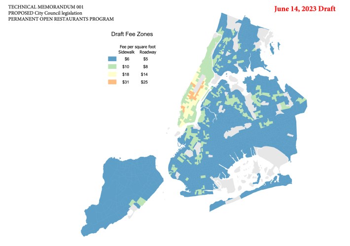 The new law requires businesses pay fees to the city to rent the sidewalk or roadway, with the square footage prices higher in hotspots like the West Village or brownstone Brooklyn.