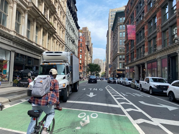 Locals said the sections near the square are already a safe place to ride due to low volumes of car traffic, but Streetsblog also observed cyclists routinely riding against traffic on the existing bike lanes.