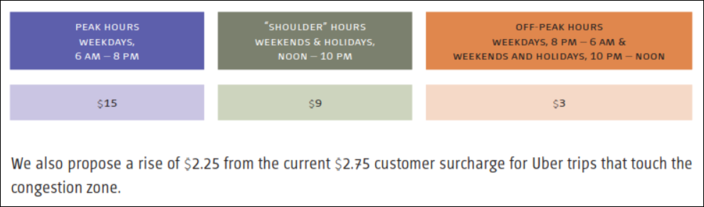 As for Gernot’s and my 15-9-3 toll plan: Using my BTA spreadsheet model (18 MB Excel sheet), we found that charging a peak-period car toll of $15 during 6 a.m.-8 p.m. weekdays, along with $3 off-peak (8 p.m.-6 a.m. weekdays and 10 p.m.-noon weekends) and a $9 “shoulder” charge at other times, bolstered by a new $2.25 surcharge on zone-touching Uber and Lyft (but not taxi) trips, will generate annual gross revenues of $1.34 billion. After netting the estimated $110 million a year for toll administration, our kitty stands at $1.23 billion, well in excess of the $1 billion a year required to bond the mandated $15 billion in congestion revenue-supported transit capital improvements.