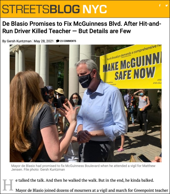 That “support” is somewhat weak. Supporters of the redesign issued a statement earlier this month saying “the new plan does not include every element that we have advocated for or was part of the DOT’s announcement in May,” but nonetheless called the truncated “Calyer Compromise” “a critical step in the right direction and … the most significant safety interventions on McGuinness Boulevard since Robert Moses expanded the road 70 years ago.”