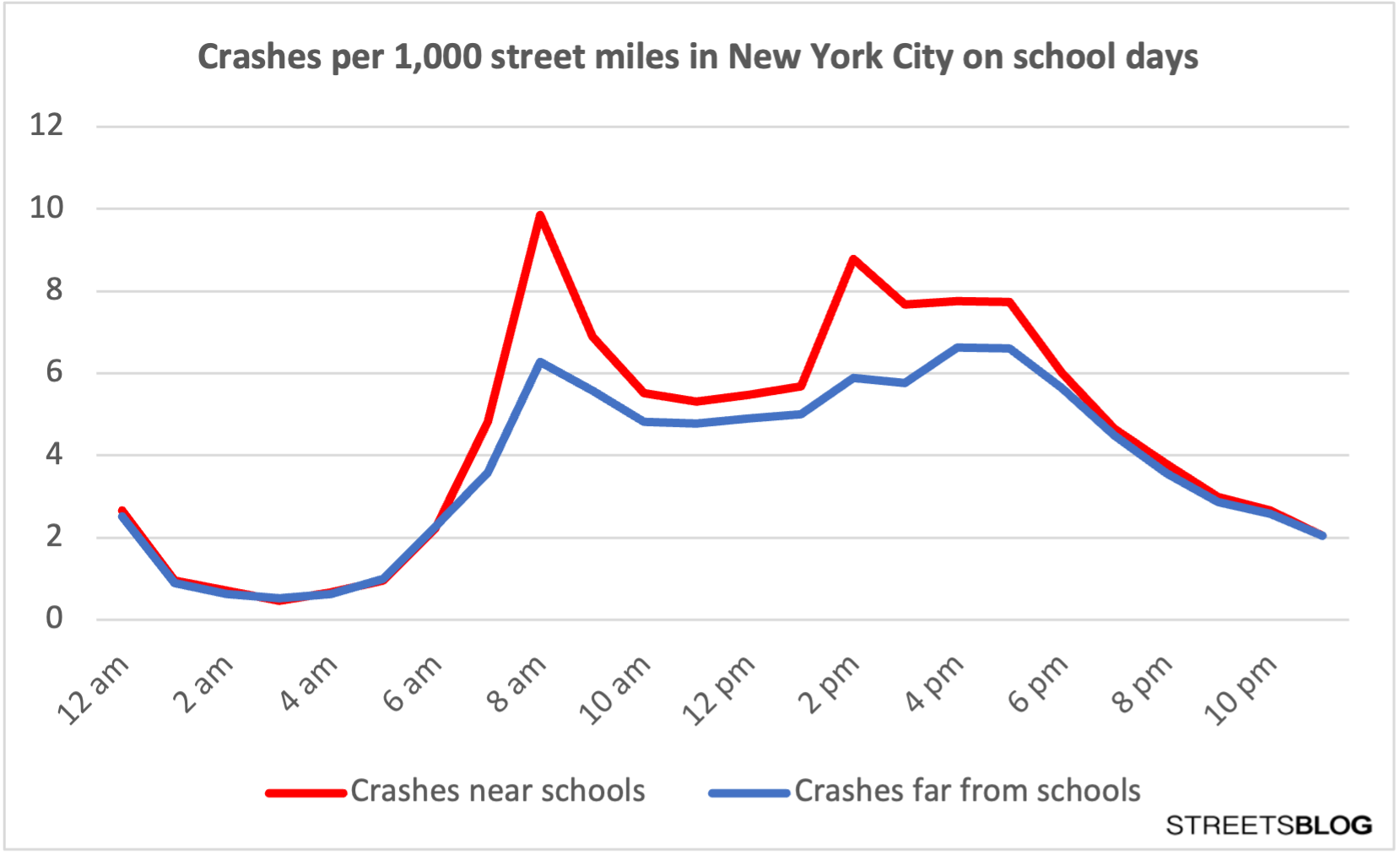 A Streetsblog investigation last year found school streets in the city are uniquely dangerous, with higher rates of car crashes and injuries than other city streets on school mornings and afternoons. The disparity is even greater around schools that mainly serve poor students and students of color. Streetsblog further found that the Department of Transportation had typically made only modest changes to the design of unsafe school streets.