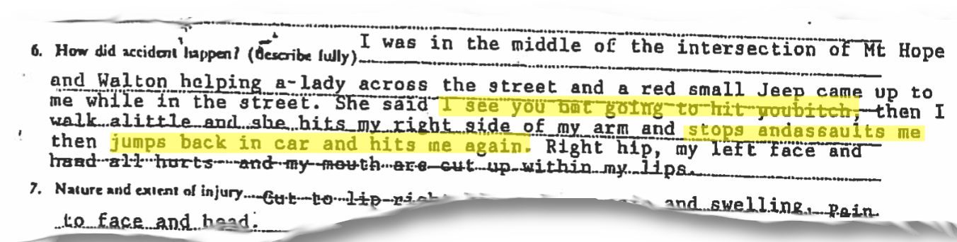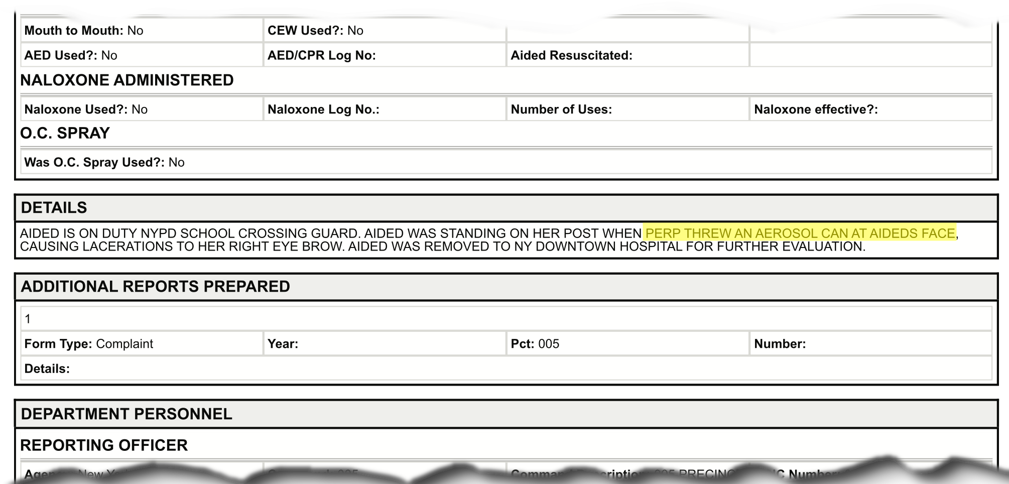 “I was crossing an elderly lady while a red vehicle came up to me, refusing to stop at stop sign and was literally touching my pants,” one guard wrote of an incident in the Bronx in 2012. The driver called the guard a “bitch,” then “came out of the car and started punching and kicking me” before she “jumps back in car and hits me again.”