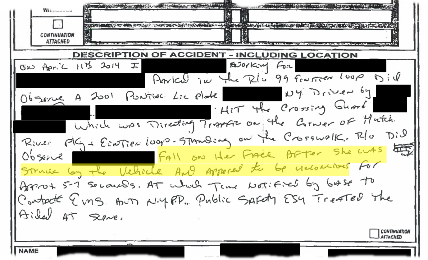 It was in a crosswalk in the Bronx in 2014 where a driver plowed into a guard from behind, pitching her body into the air and causing her to “hit the ground with her head first,” police wrote in a workers’ compensation claim. She “appeared to be unconscious for approx 5-7 seconds,” a witness wrote.