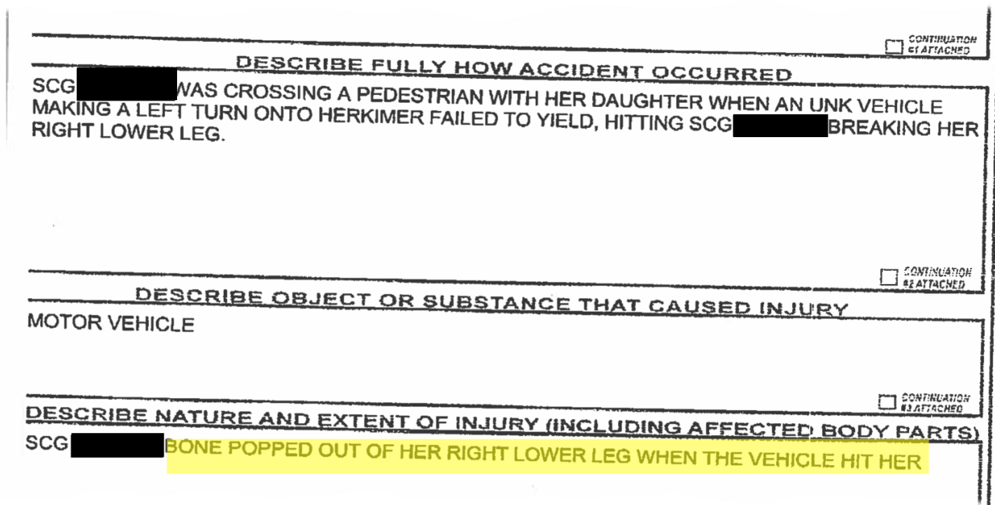 “Bone popped out of her right lower leg when the vehicle hit her,” the workers’ compensation claim noted. That driver too told police he didn’t see the guard.