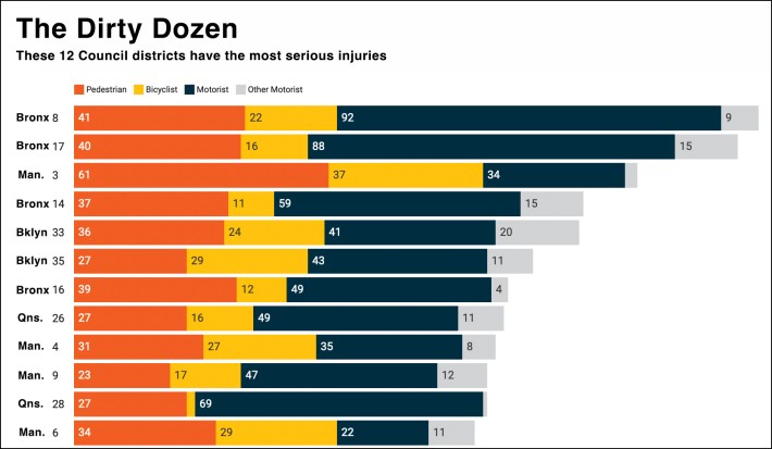 In the Vision Zero era, fatalities tend to garner the most attention, but serious injuries tell the larger story of the daily carnage on the streets of New York, where 11 people are severely injured for every person killed, according to the advocacy group’s analysis. And serious-injury-causing crashes occur at a higher rate in the lower income parts of the city, 21 percent higher in the 10 poorest Council districts than for the city as a whole.