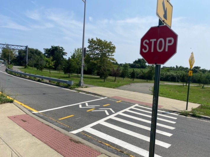 There were many short crossings at the Belt Parkway interchange that didn’t have any stop signs for cars zooming off the highway, but there were signs telling pedestrians and cyclists to stop.