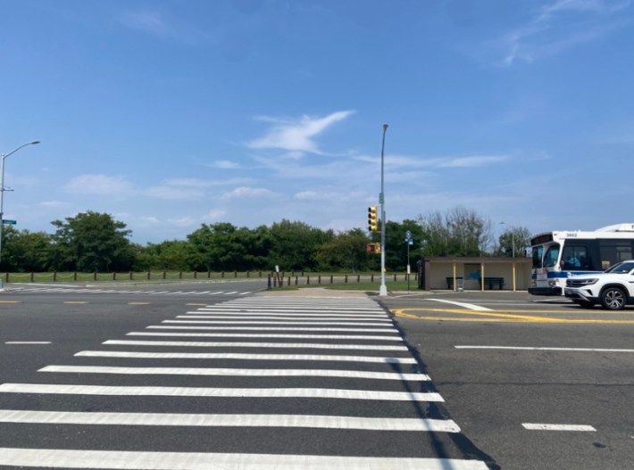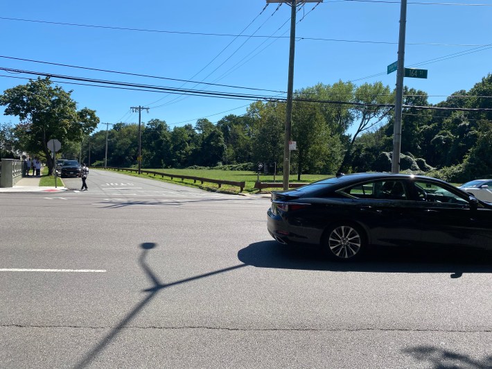 The path stays bumpy and unkempt on the short section after that. Suddenly, the offshoot road Shore Road Drive bisects the bike and walking path, and there are no signs warning drivers zooming toward the Belt Parkway to slow down and stop for people crossing.