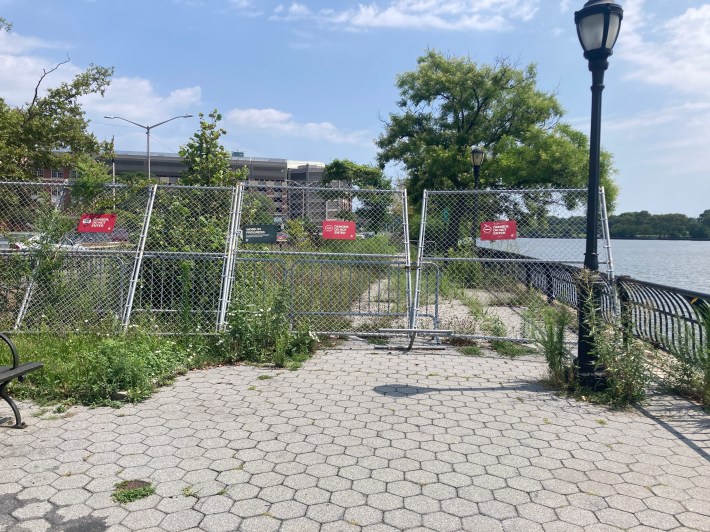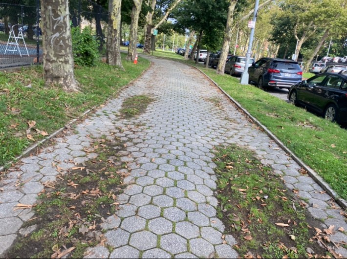 The city used hexagonal tiles, which are prone to cracking, becoming uneven, and removed from the path, making for frequent potholes. There was a sinkhole at one location that pulled down a lot of these six-sided tiles, where the city fenced it off similarly to another recent cave-in on the Hudson River Greenway, and tree roots have broken through some sections of the path.