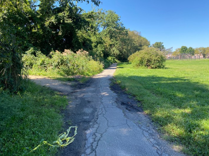 The unmarked path looks as if it hasn’t been visited by the Parks Department in years. The hexagonal pavers make the terrain extremely bumpy and there are bushes, weeds, and low-hanging branches that intrude into the trail. There were also piles of garbage littering the path throughout.
