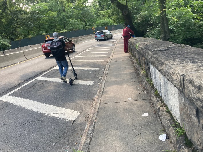The supposedly two-way bike lane and shared pedestrian path was so narrow on the overpass crossing the Bronx River that maybe one biker could get through there, and there’s also no barrier between the path and cars zooming past beyond some stripes of paint and the raised curb.