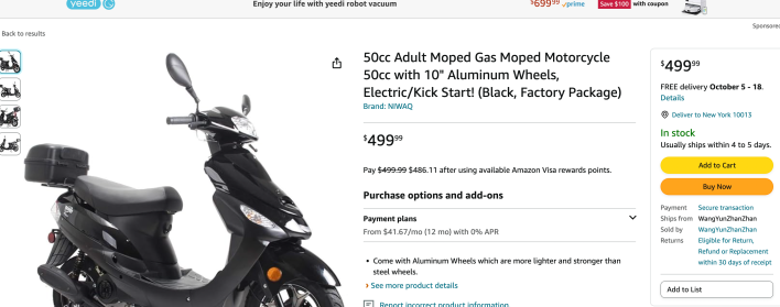 The Jeff Bezos-owned e-commerce behemoth is skirting the legislation — known as Local Law 39, which prohibits the sale of batteries that are not approved by the nationally recognized UL Solutions (Underwriters Laboratory) — by still offering mopeds for as little as $500 and uncertified lithium-ion batteries for as little as $219. Those items can be shipped to anyone’s doorstep, even as the Department of Consumer and Worker Protection has begun enforcement against brick-and-mortar retailers selling such items due to a spate of deadly infernos attributed to the shoddy power packs.