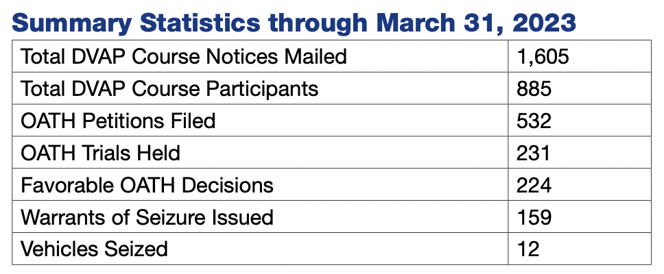 “The long period between initial DVAP course notification and the point at which a covered vehicle is eligible for seizure is in many ways the unavoidable consequence of a program in which multiple government agencies use different systems for data management and program administration,” the report said. “No single database management system could be used by all parties involved in the program’s administration.” (Insert collective sigh here.)