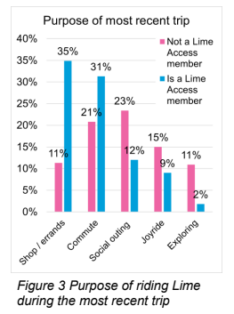 Participants in the Lime Access program, which grants discounts of around “70 or 80 percent” to riders who qualify, were significantly more likely to list essential reasons like “shopping” for groceries (35 percent) and “commuting” (31 percent) than non-Access riders, 11 and 21 percent of whom rode to complete errands or go to work, respectively.