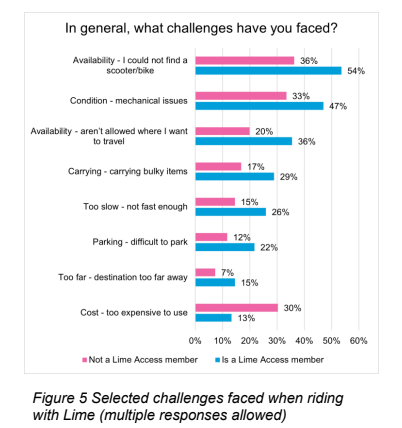 Most Access riders (54 percent) reported frustration with not being able to find a vehicle when they needed it, suggesting that cities may need to relax fleet caps, and that operators may need to do a better job of reshuffling bikes and scooters into the neighborhoods where people need them most. More than a third of them (36 percent) said that they couldn’t always take micromobility to the places they needed to go, thanks to slow- and no-ride zones that automatically throttle vehicle speeds when they passed invisible digital borders called “geofences.”