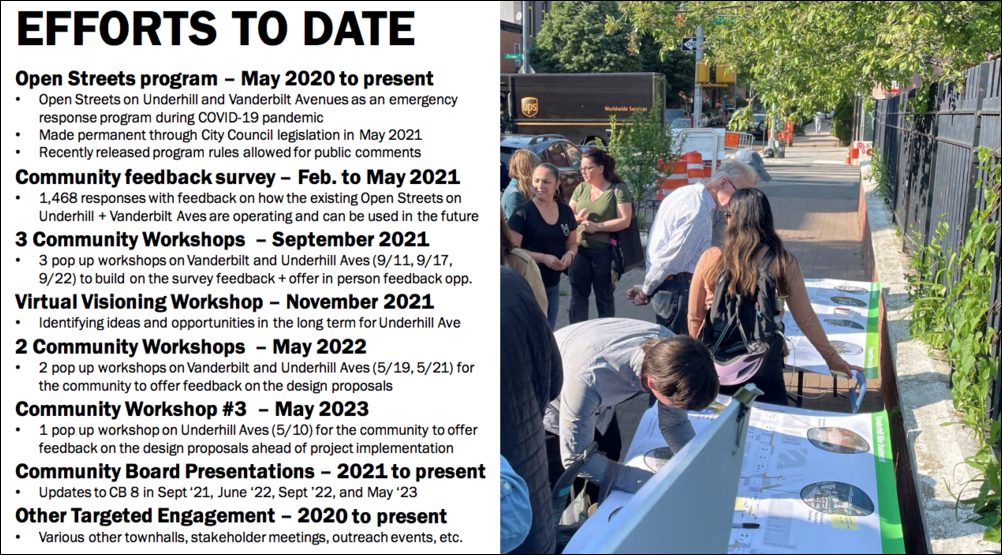 History also shows that the DOT moved slowly and did substantial outreach in the area, finding support for the bike boulevard. Between 2021 and 2023, the DOT met with Brooklyn Community Board 8 four times on the subject of open streets in the Prospect Heights area. The agency also held six in-person community workshops, one virtual visioning workshop and a four-month community feedback survey to see how the neighborhood felt about the Underhill and Vanderbilt open streets.