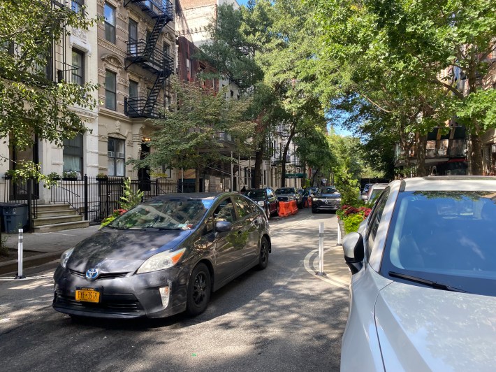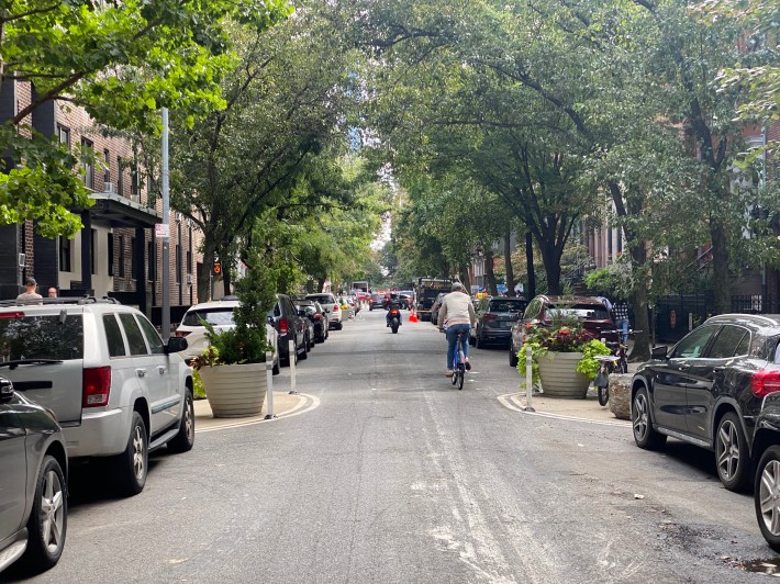 To narrow the roadway along the block, DOT also installed five painted curbside semicircles with flower pots and flex posts, which make the roadway slightly tighter than the row of parked cars. Drivers largely whizzed through those without diminishing their speed.