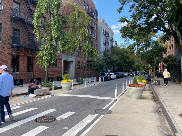 DOT has been transitioning other open streets around the city into permanent makeovers this year. Most notably is the “gold standard” transformation of 34th Avenue in Queens into a 1.3-mile, largely car-free thoroughfare, thanks to full “plaza blocks” that divert cars and prevent through traffic entirely.