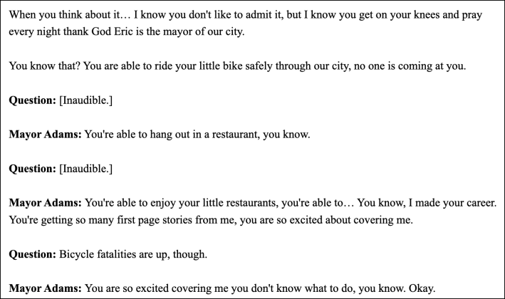 It all started when Daily News reporter Chris Sommerfeldt asked Hizzoner a fairly routine question about possible primary challengers in 2025. Rather than answer, Adams decided to go off in a self-aggrandizing direction. You have to read it to believe it: