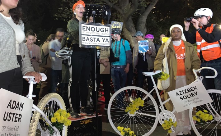 In addition to the protesters caught on Eckerson’s camera, also present was Frédérique Uster-Hug, whose husband, Adam, was killed by a truck driver in Brooklyn in May. Echoing her moving Streetsblog op-ed earlier in the week, she spoke eloquently about how street safety is not just about cyclists, but about all road users, including the drivers who kill us and are also killed in huge numbers, too.