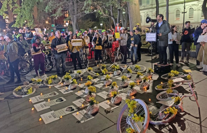 The big story yesterday, of course, was that more than 200 cyclists showed up for the “Enough!” ride-and-rally for safe streets — a protest provoked by the 26 cyclists (not to mention more than 65 pedestrians and more than 90 motorists) who have died in crashes so far this year.