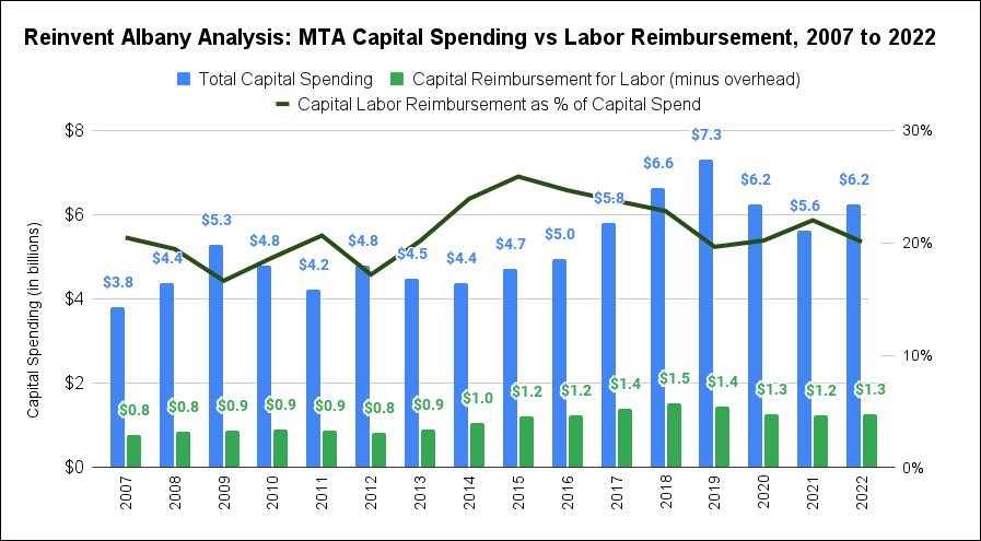 Roughly 21 percent of the MTA’s capital expenditures since 2007 have gone to pay in-house workers, Reinvent Albany said. Last year, that translated to $1.3 billion in wages. The more money the MTA spends on capital renovations — i.e. trackwork, signal upgrades and other in-house engineering — the more money will go to the laborers.