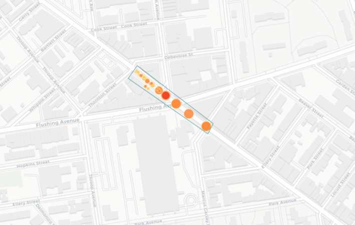 Despite the NYPD’s narrative, Broadway between Thornton Street and Sumner Place is an exceptionally dangerous 650 feet of roadway. Since January 2019, there have been 197 reported crashes, causing injuries to 90 people, including 23 cyclists and 26 pedestrians, according to city stats compiled by Crash Mapper. One other pedestrian has been killed.