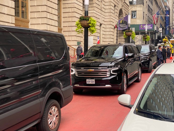 With that, the mayor then left the event (one of his regular flag-raising ceremonies in Bowling Green) by hopping into his SUV (which had been illegally parked in the bus lane) for the loooong drive back to City Hall, which is just a 15-minute walk away.