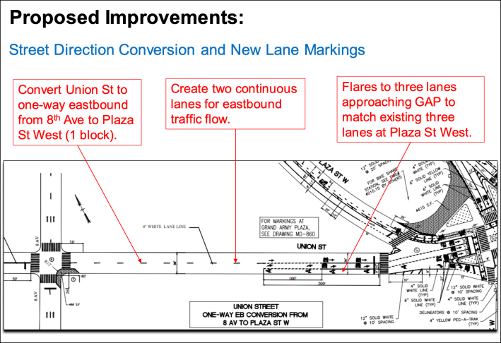 But drivers say Eighth Avenue fails them because of the aforementioned bottleneck: Northbound Eighth backs up epically at two-way Union Street because many drivers want to turn right to access the ultimate Brooklyn shitshow: the intersection of Flatbush Avenue, Eastern Parkway and Grand Army Plaza.
