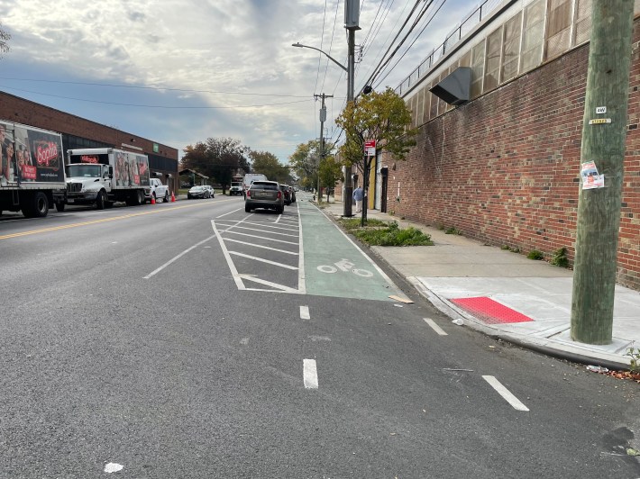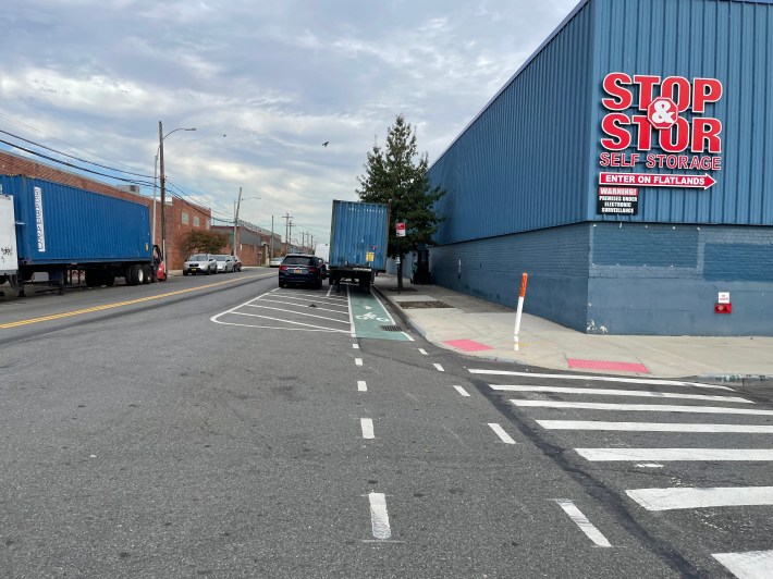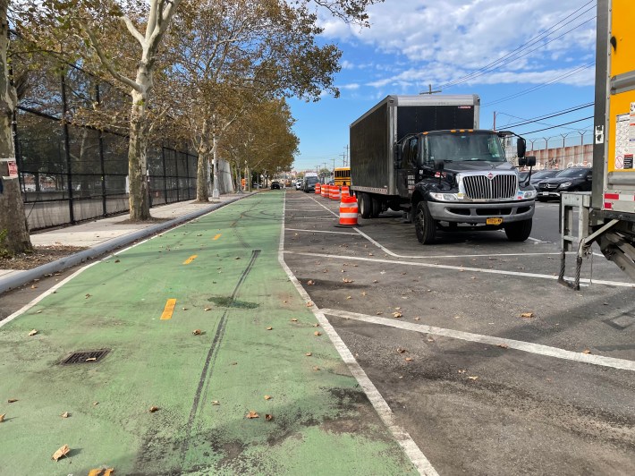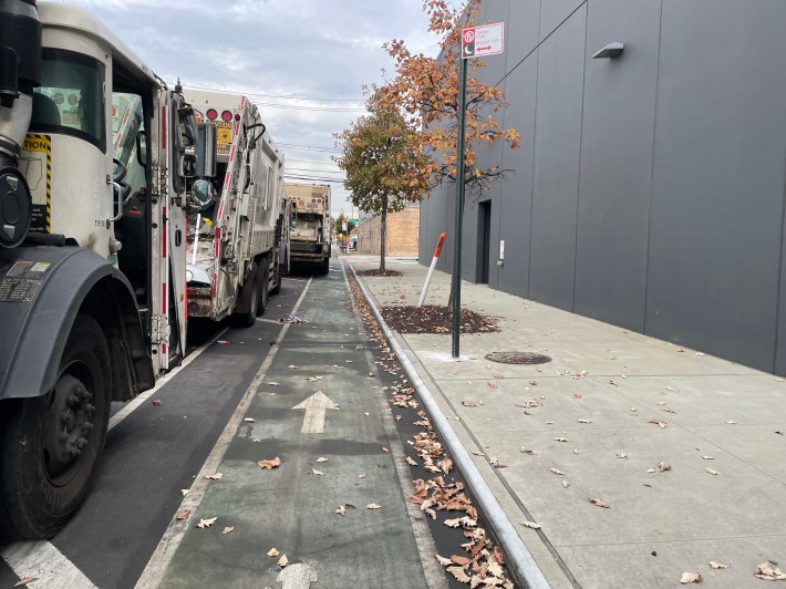 The bike lane also suffers from the typical issues that plague protected bike lanes in industrial areas — specifically, cars and trucks that block the path…